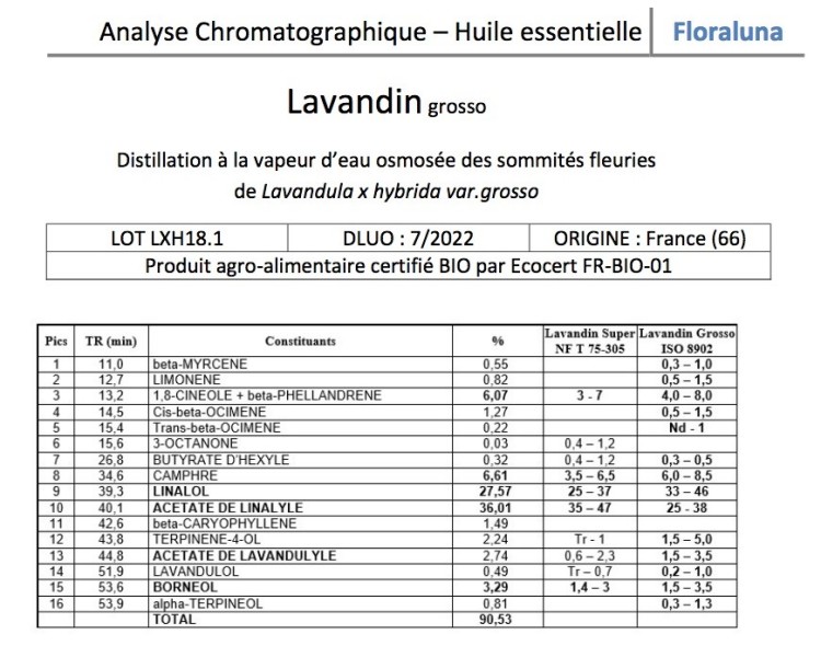 Principaux constituants : Acétate de linalyle (35 à 45%), Linalol (25 à 40%), 1-8 cinéole (3 à 7%), Camphre (3,5 à 6,5%)