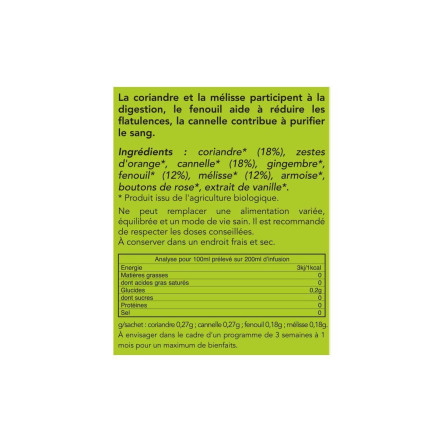 Ingrédients : coriandre*(18%), zestes d'orange*, cannelle*(18%), gingembre*, fenouil*(12%), mélisse*(12%), armoise*, boutons de rose*, extrait de vanille*