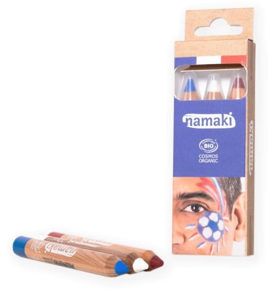 Lot de 3 crayons de maquillage naturel : bleu, blanc et rouge.