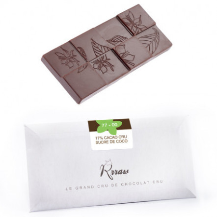 Tablette de chocolat cru artisanal et biologique à 77% de cacao cru et 13 % de sucre de noix de coco.
