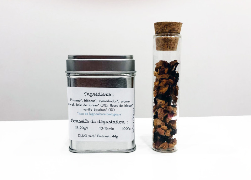 Pomme*, hibiscus*, cynorrhodon*, arôme naturel, baie de sureau* (3%), fleurs de bleuet*, vanille bourbon* (1%).