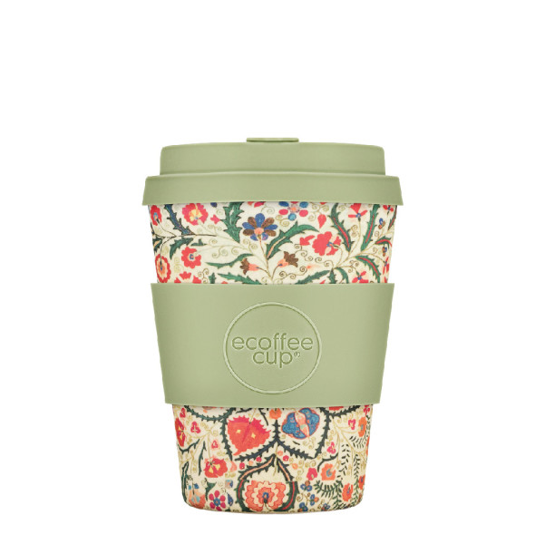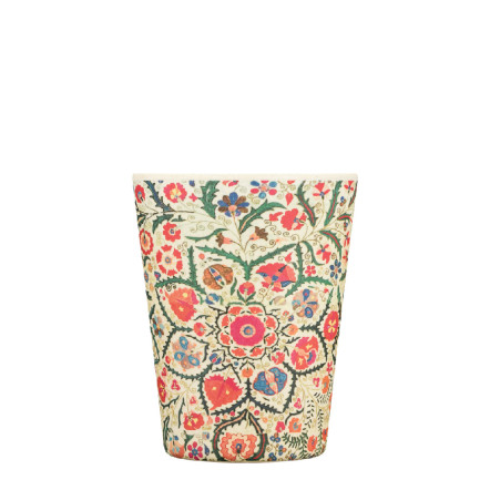 Une jolie tasse en bambou fleurie avec son couvercle en silicone pour déguster sa boisson chaude ou froide.