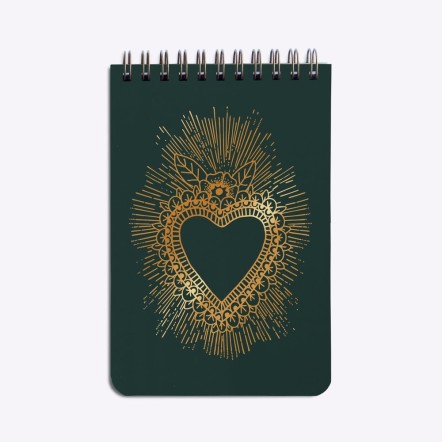 Voici un carnet que l'on prendra plaisir à ouvrir, feuilleter, remplir... Sa couverture couleur vert sapin, encrée d'une illustration de cœur décoré couleur bronze en fait un très bel objet.