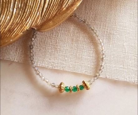 Bracelet en pierres fines de Labradorite et Onyx vert facettées et breloques dorées à l'or fin.