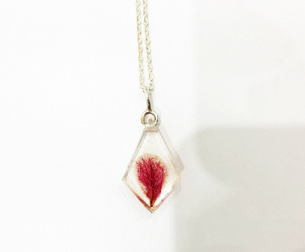 Pendentif en résine biosourcée et pétale de fleur de grenadier, monté sur un anneau en argent massif et une chaine en plaqué argent.