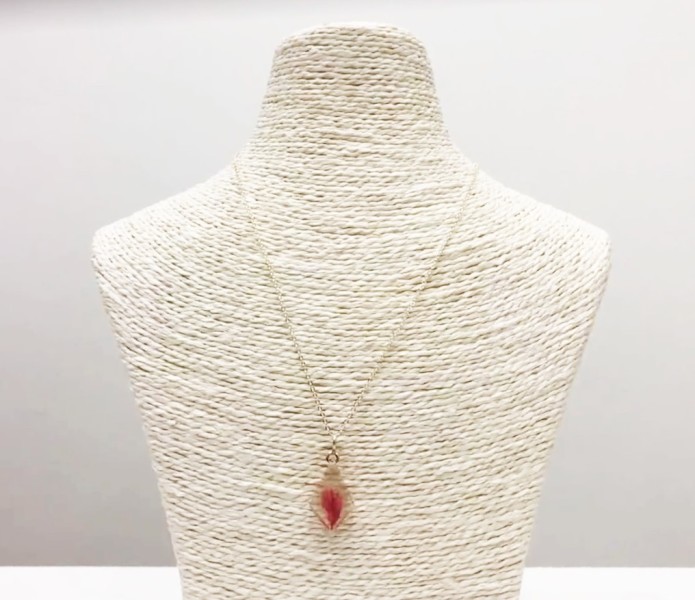 Fait à la main avec un véritable pétale de fleur de grenadier, ce pendentif fait bel effet.